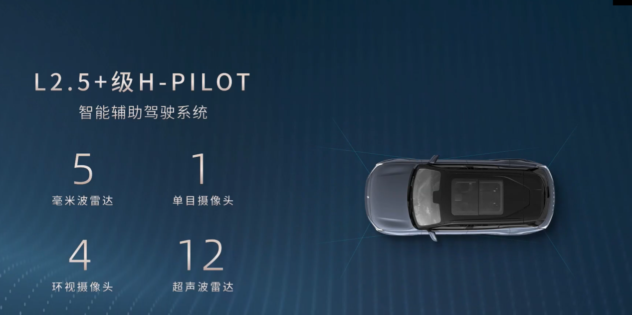 Hengchi 5 has L2.5 + H-PILOT intelligent driving assistance, equipped with Mobi leye vision chip, 1 monocular camera, 4 surround camera, 5 millimeter wave radar, 12 ultrasonic radar, so that the vehicle can cope well in the face of various road conditions. In terms of intelligent driving, Hengchi 5 is equipped with 19 advanced intelligent driving auxiliary features such as full speed domain adaptive cruise, lane keeping, and traffic congestion assistance.